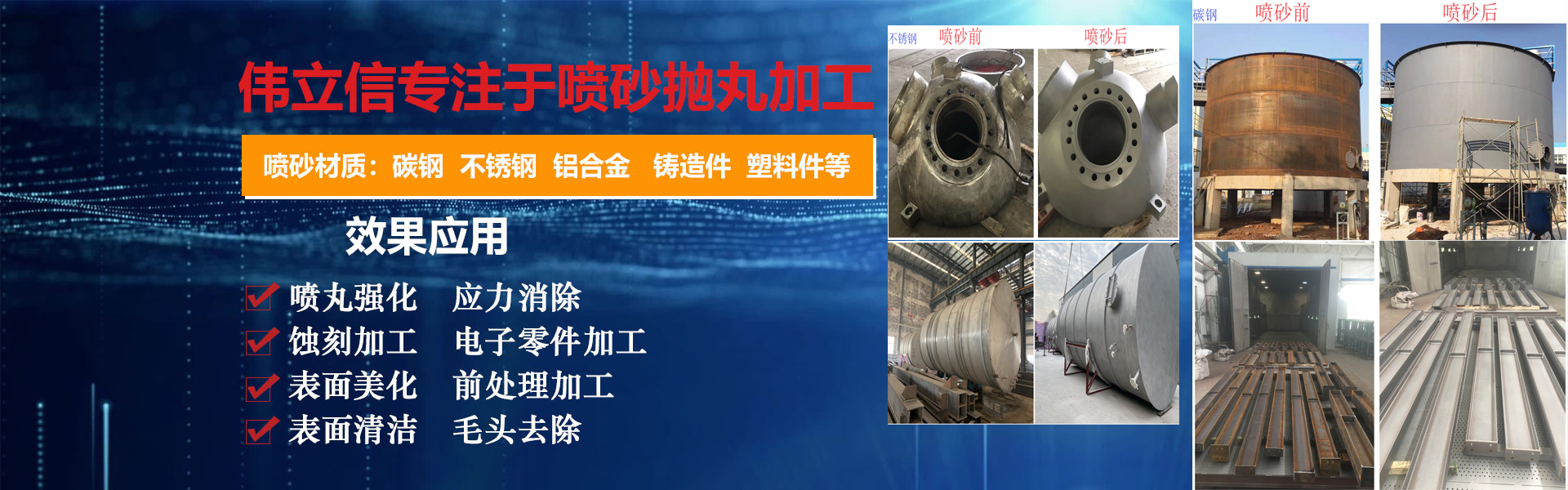 武漢偉立信機(jī)械設(shè)備有限公司(噴砂熱線:18186495283)是一家從事表面涂裝和表面清理設(shè)備的廠家,公司位于武漢市武昌區(qū)。是一家集表面涂裝和表面清理設(shè)備科研、開發(fā)、生產(chǎn)、銷售、服務(wù)于一體的綜合型企業(yè)。     公司自創(chuàng)建以來,一直秉持認(rèn)真、負(fù)責(zé)的態(tài)度,以其科學(xué)而嚴(yán)密的管理,先進(jìn)而不斷創(chuàng)新的技術(shù),致力于表面處理設(shè)備的研制和開發(fā),主要產(chǎn)品有:手動噴砂機(jī)、自動噴砂機(jī)、開放式加壓噴砂機(jī)、干濕式噴砂機(jī)及大型噴砂房,拋丸機(jī),除塵設(shè)備,另可根據(jù)客戶要求定做。低價經(jīng)營各類噴砂磨料:玻璃珠、鋼砂、鋼丸、不銹鋼丸、鋼絲切丸···